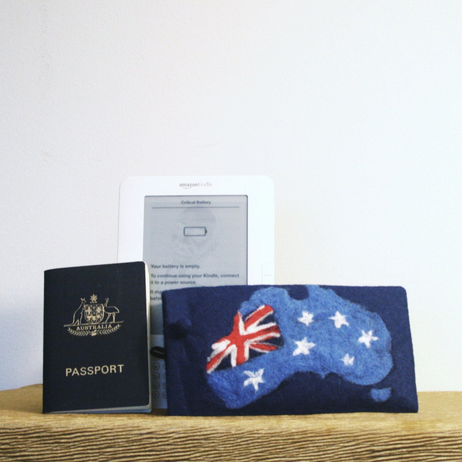 Australian, Multi Use Pouch, I felted by hand, this proud design in red white and blue Merino wool, onto navy blue felt! And I think it looks Great! I also added an elastic loop, and felt button for closure!