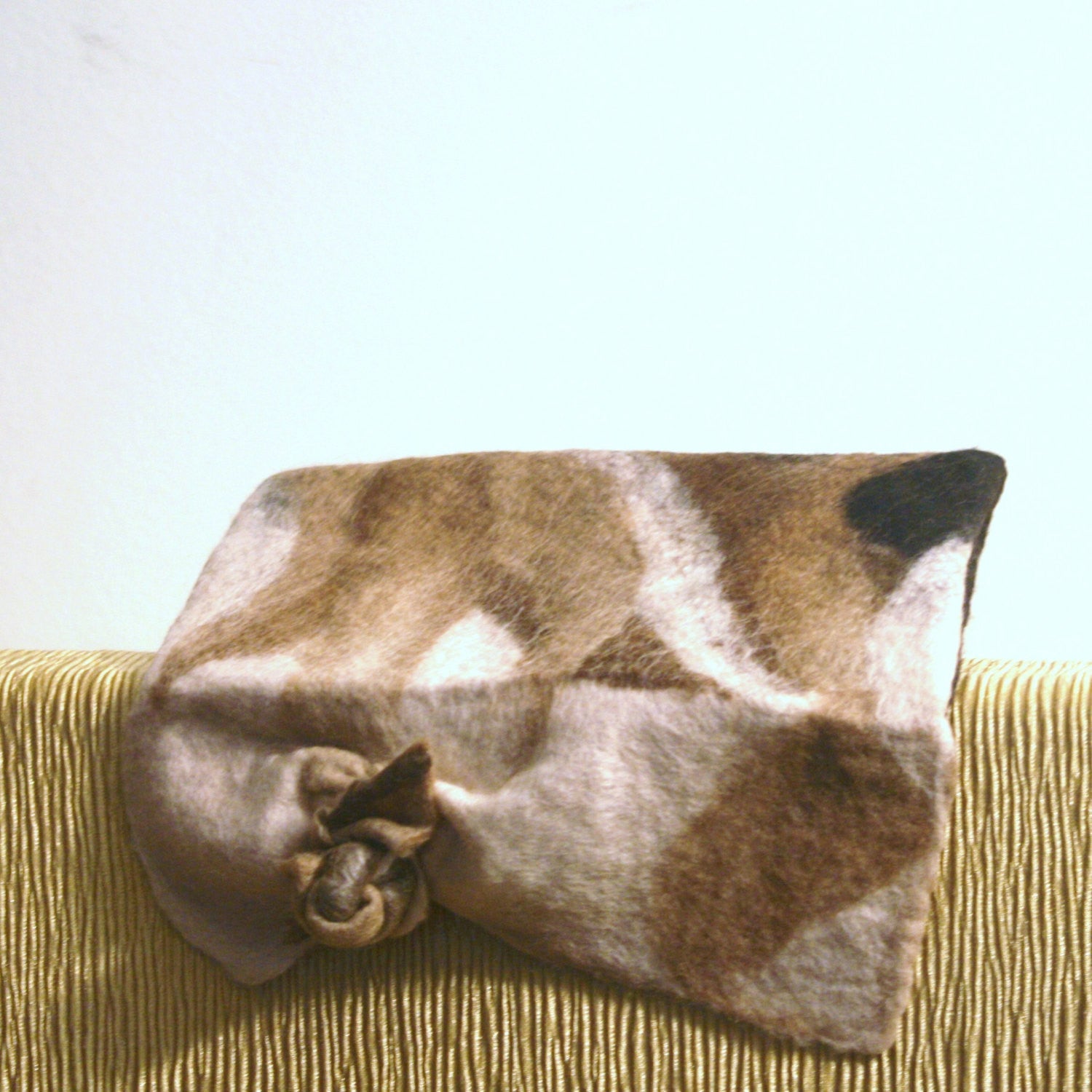 Brown Wool Clutch, I wet felted by hand this electronic case in lovely tones of browns, from black to cream in Merino wool, and attached hand felted roses above a magnetic clasp!