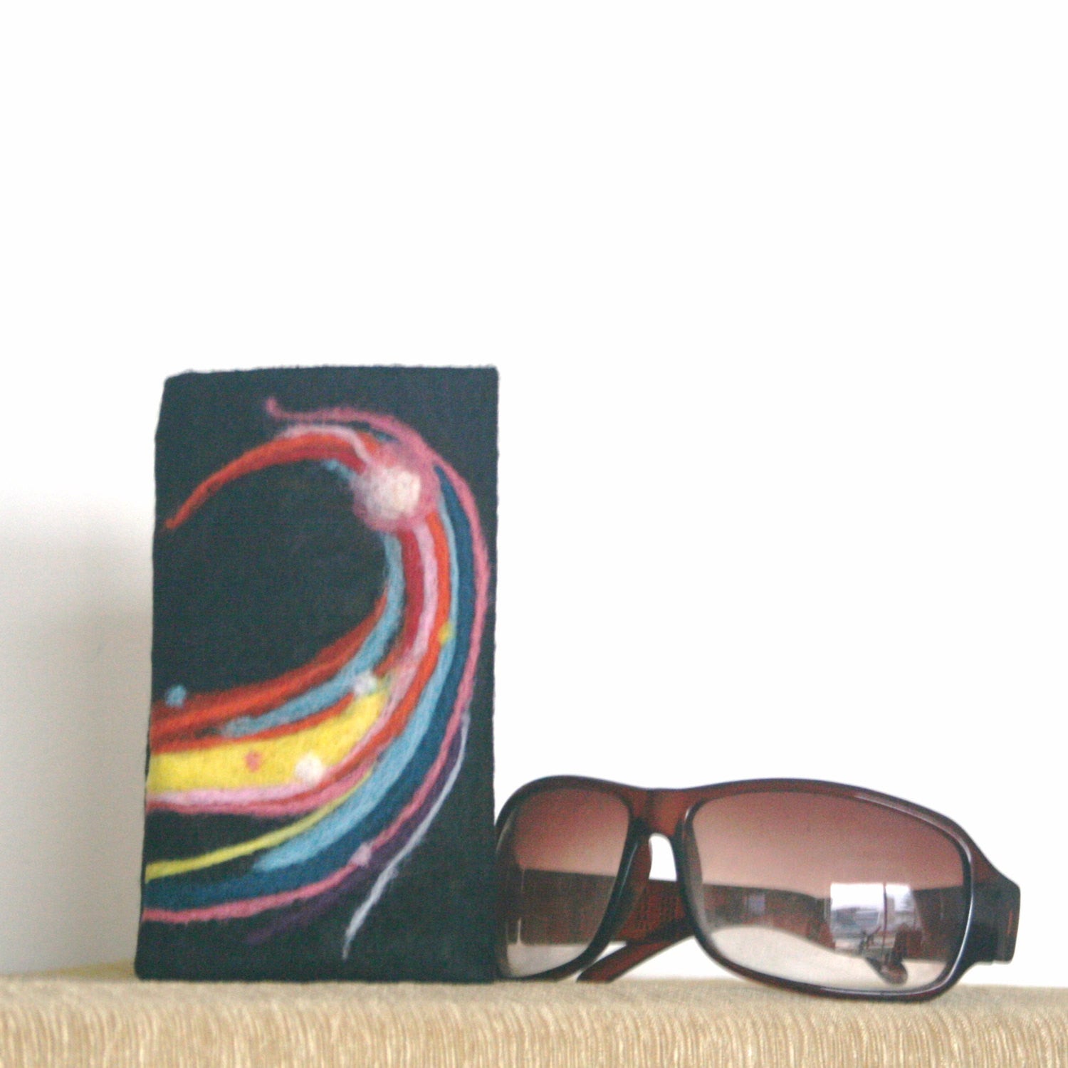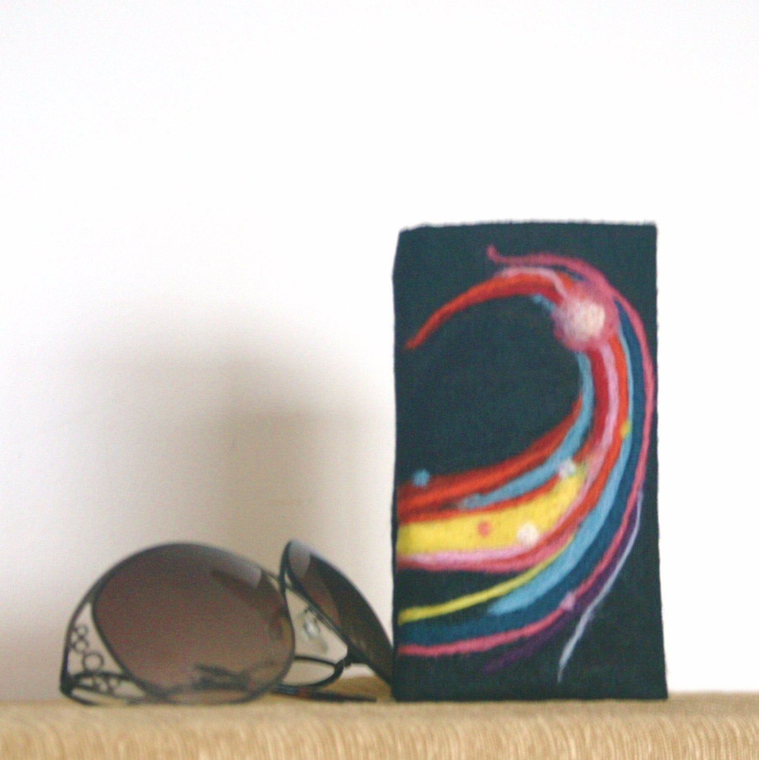 Colorful Wool Glasses Sleeve,I felted by hand, this rainbow fiber art design with merino wool, onto a black felt,The Colors stand out beautifully against the black!