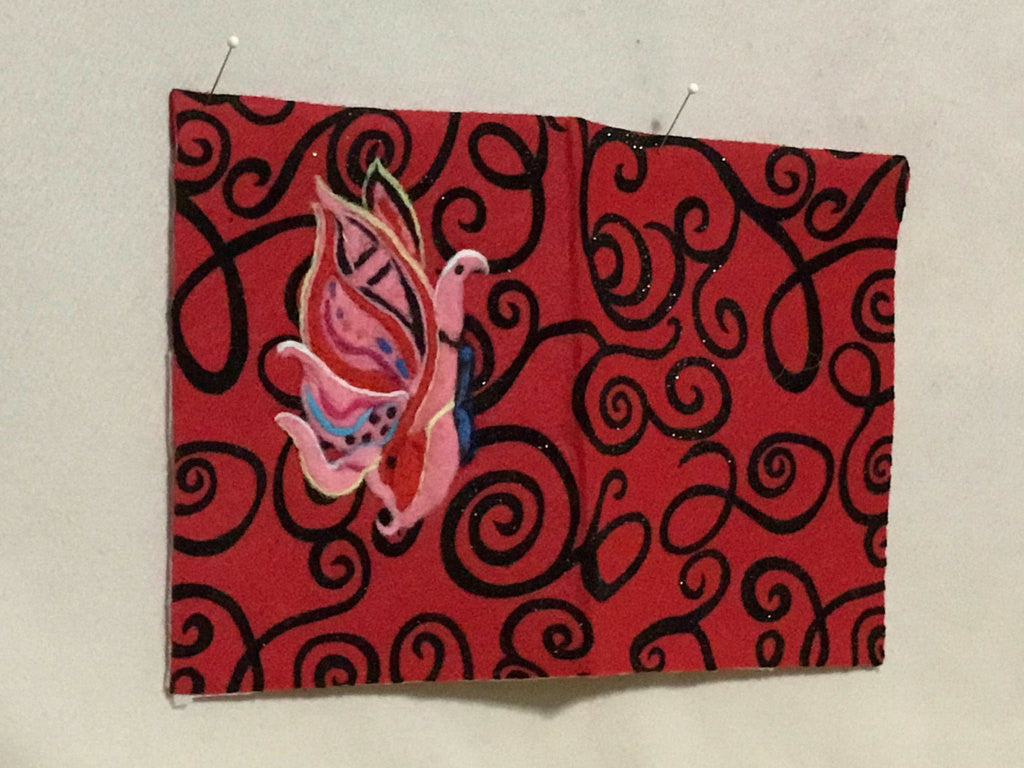 I Needle Felted this Butterfly in Pink Merino Wool,onto A red Embossed felt background,