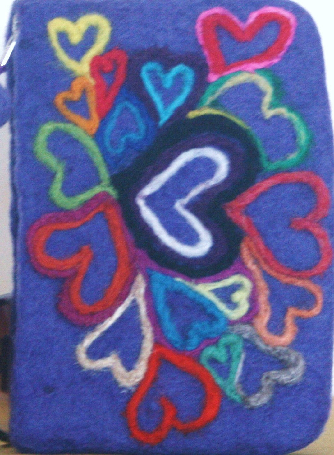 Felt Hearts Coin Purse, I needle felted multi hearts on this wool camera case, in all colors of merino wool onto a lavender/blue felt.