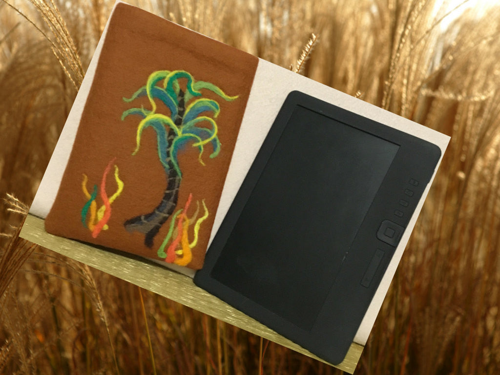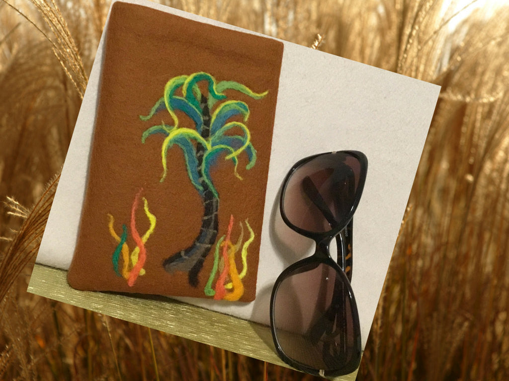 Onto a Tan felt Base I needle felted by hand, a green Palm Tree in Merino wool.