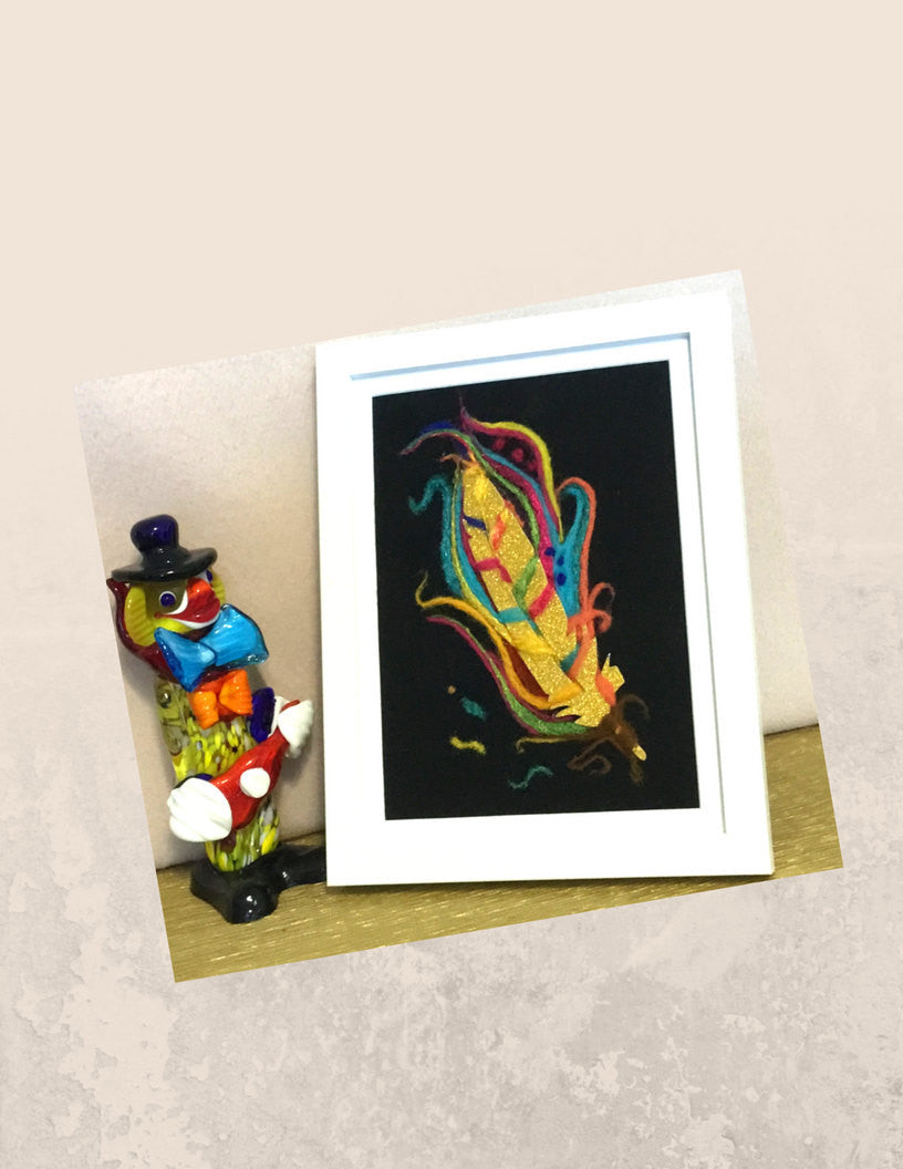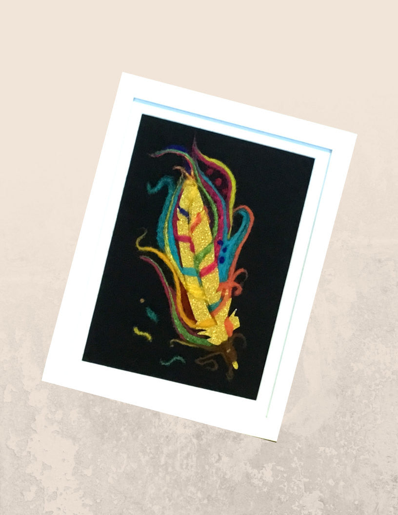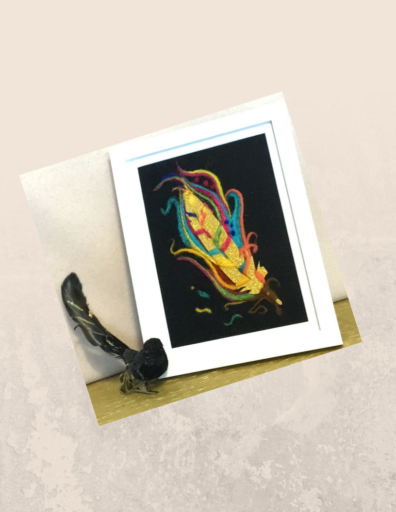 this design with rainbow colours in Merino wool, and a special Glitter Fibre...Onto and around a Synthetic Gold Feather.... onto a black felt background.