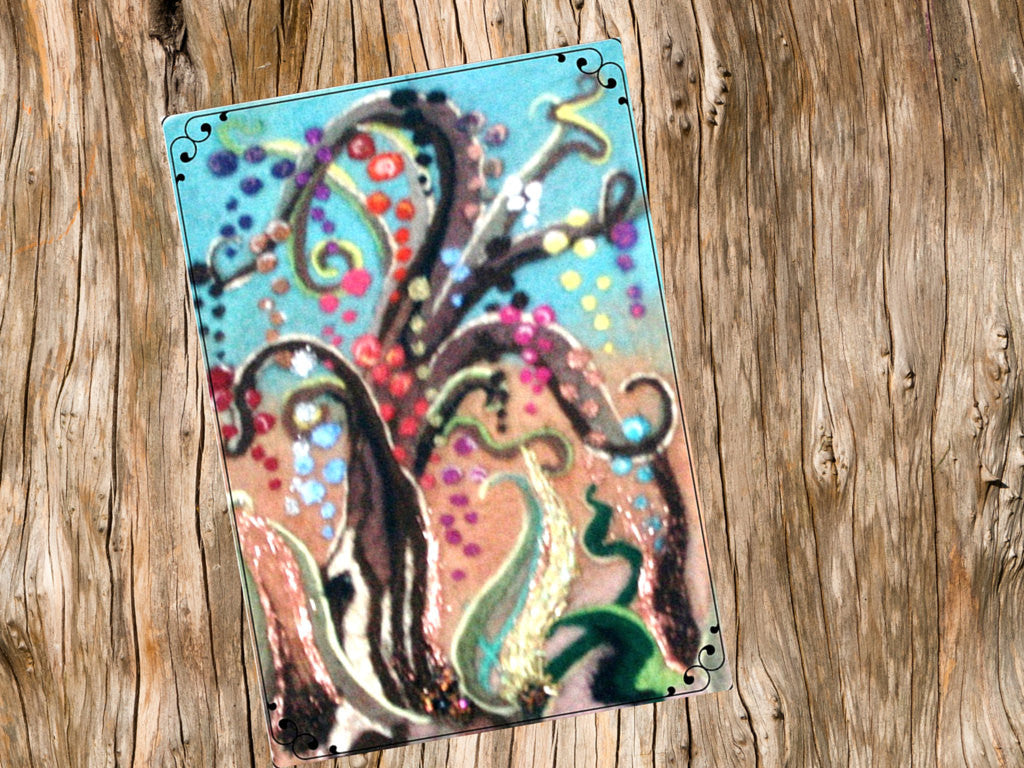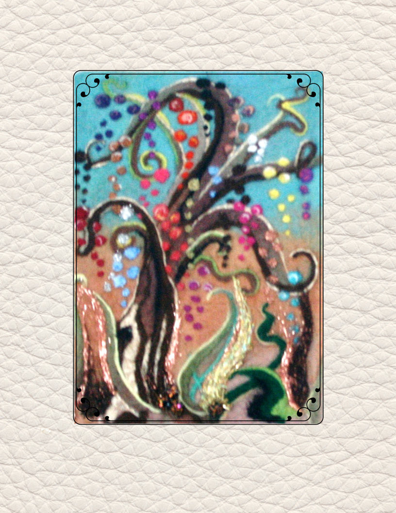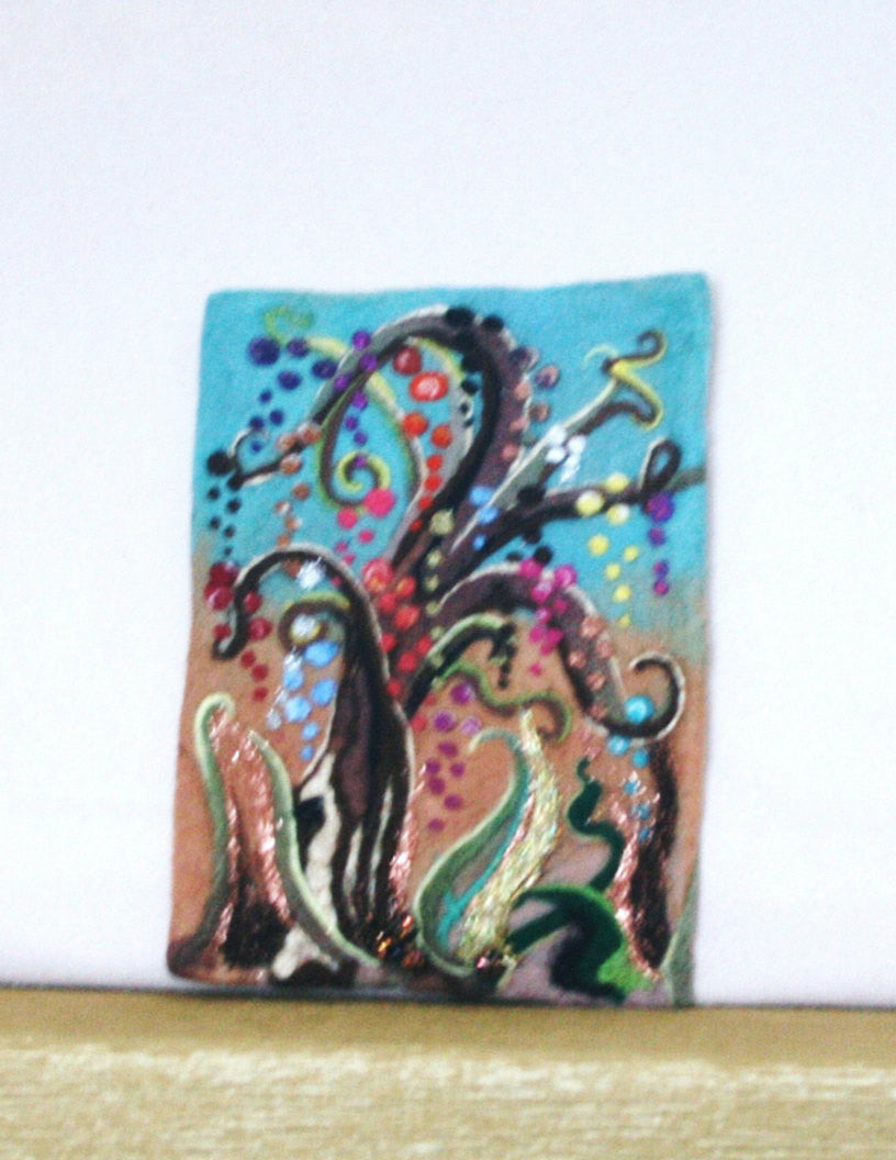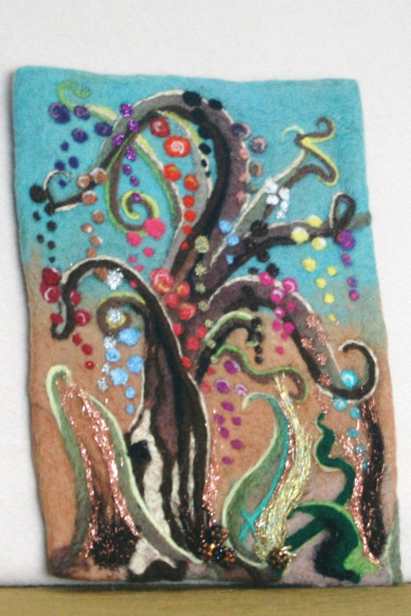 Needle Felted Wool Picture, I wet felted by hand, the base in aqua and a light tan Merino wool, I then Needle felted my Glitter Tree, with Merino wools of all colors, Silk fibers, and sparkling Angelina fibers, adding multi colored beading at the base and long, loose Angelina fibers to the 3D design at the base.