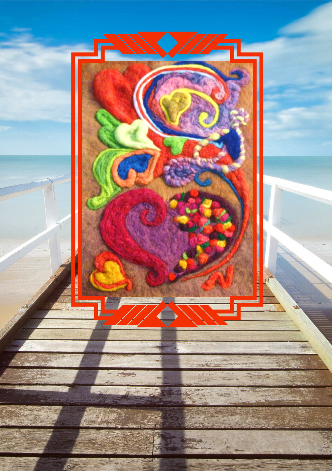 Needle Felted Wool Painting, I wet felted by hand, with taupe and brown colored Merino wools. I then needle felted my *Heartfelt* design in all lovely bright colors!