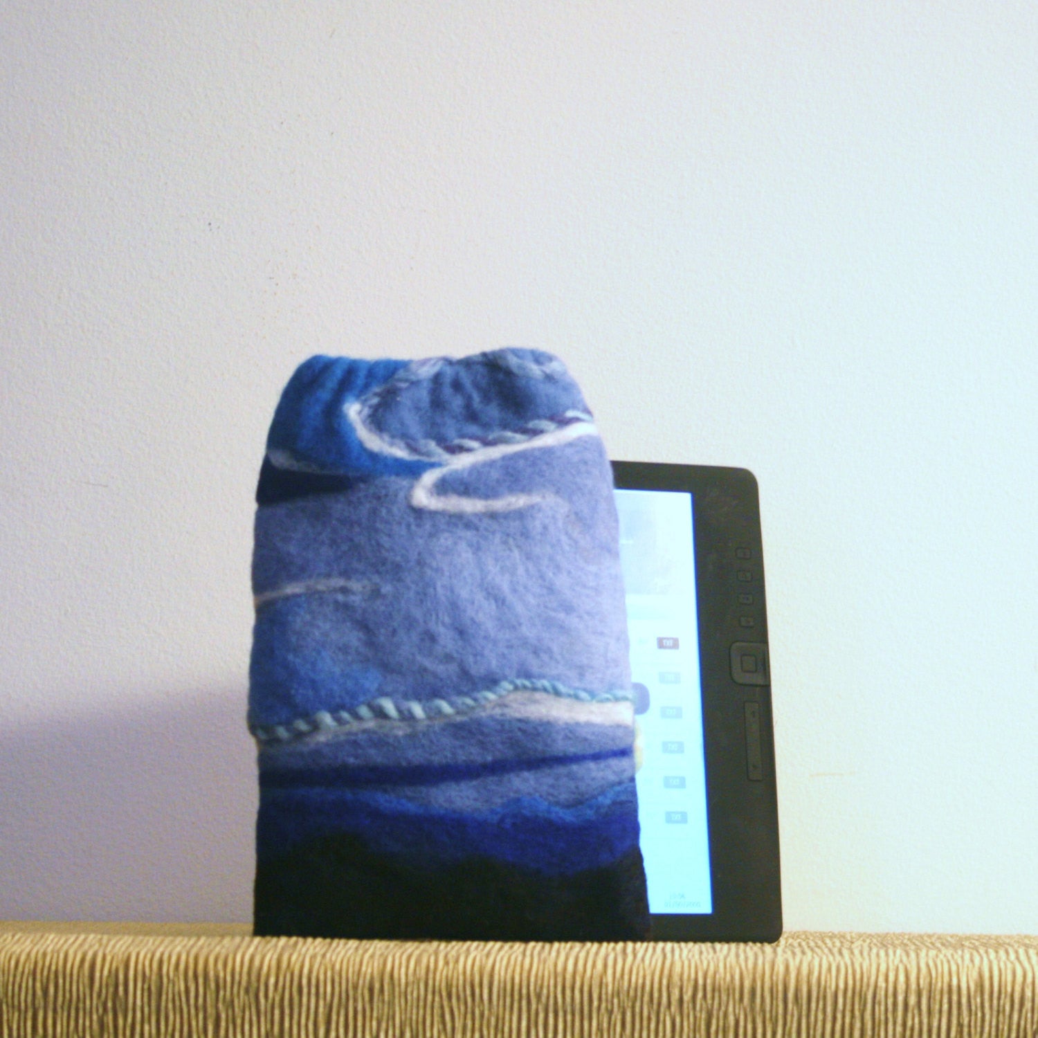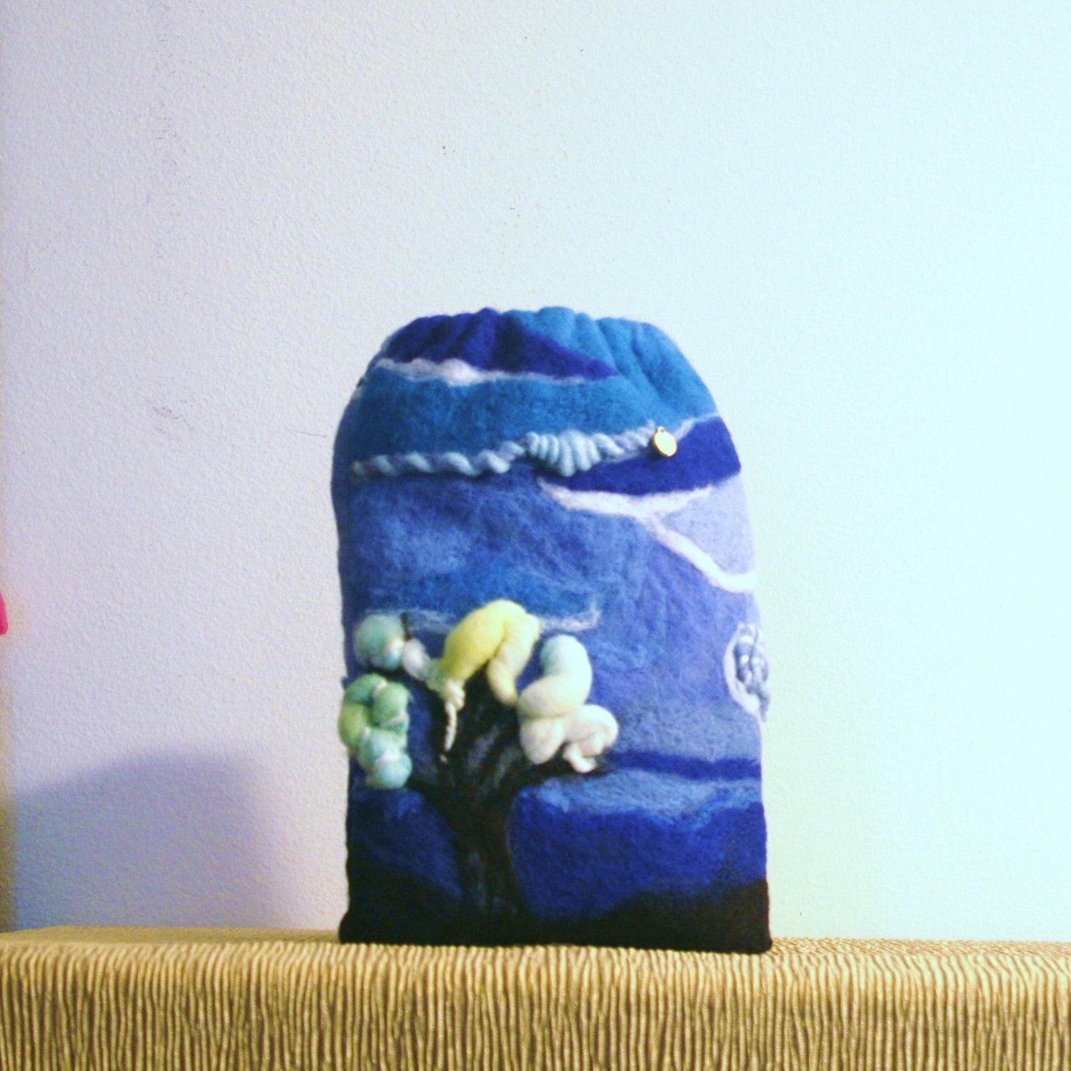 Wool electronic sleeve, I needlefelted by hand, this blue sky's design, with an Elastic Top, in Merino wool! With a design that continues from front to back!