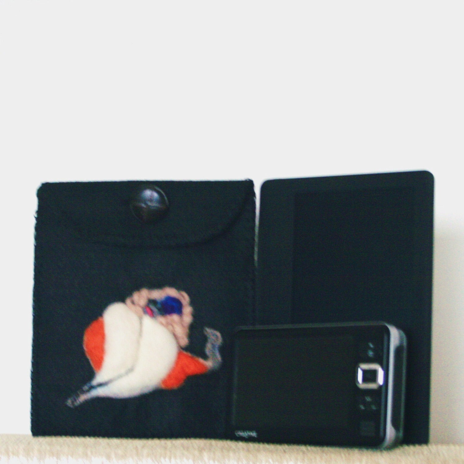 Wool Multi-Use Pouch, Onto a slate colored felt, I needle felted this design of my Fur Coat Lady. adding a Leather-look button for closure!